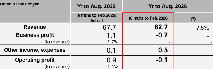 报告期内,营收下降至627亿日元(-7.5%),亏损7亿日元(2025财年同期为盈利11亿日元)。