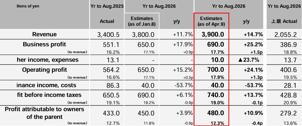 基于当前销售环境,集团对下半年业绩预估进行了上调:预期全年营收将达到3.9万亿日元,营业利润达7000亿日元。