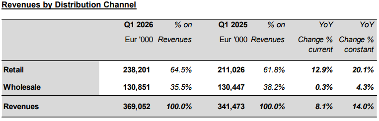 总体而言,零售渠道持续受益于新客户的拓展和现有客户平均消费额的增长。这凸显了品牌的吸引力及其在与客户关系中随着时间推移而创造价值的能力;在此背景下,销售组合的积极贡献也十分突出,其中最具特色的产品占比不断提高。
