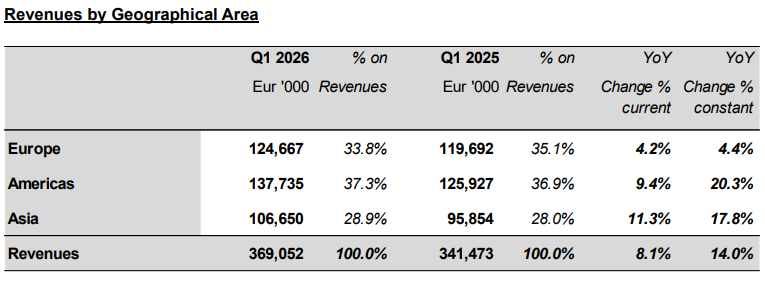 营收按固定汇率计同比增长4.4%至1.247亿欧元。欧洲整体的贡献比例为33.8%,其中意大利的贡献比例为11%。