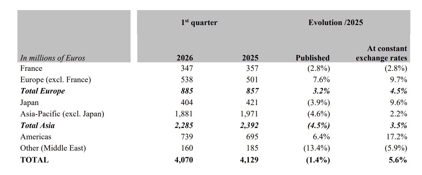 截至2026年3月底,美洲、日本和欧洲(不含法国)录得强劲增长。尽管与中东局势相关的旅游客流放缓,集团直营门店销售额同比仍增长7%。此外,批发业务受到对特许经营门店(尤其是中东和机场)销售下降的显著影响。