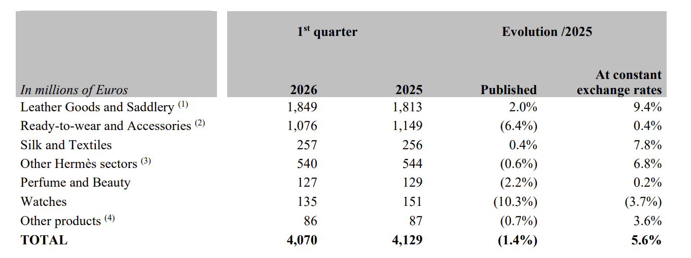 截至2026年3月底,皮具和马具、其他爱马仕业务部门以及丝绸和纺织品部门均录得稳健表现。