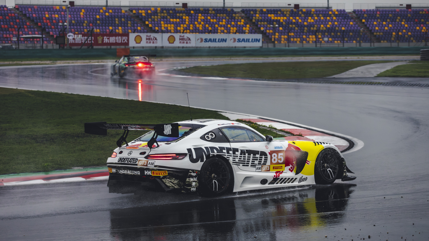 紧随其后,中国超级跑车锦标赛(China GT)上海站接棒启幕。其中,一辆涂装迷彩的赛车与车身上的“五条杠”Logo 格外醒目——车手王一博的名字与“UNDEFEATED”字样并排出现在车身上。
