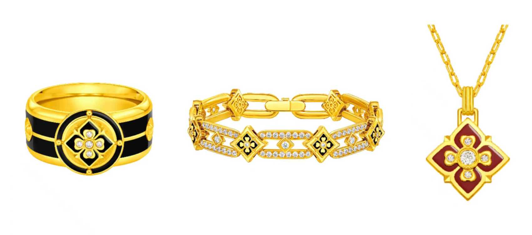 为使古老纹样焕发当代轻盈感,系列运用内填鎏彩、镜面抛光等工艺,将厚重的传统图腾转化为灵动的立体线条,同时部分作品采用高端鎏彩,配合镂空立体浮雕工艺,使黑红色彩依形嵌于黄金之上,再以0.01毫米级精密公差雕磨,实现各部件无缝衔接,配合包镶、铲边镶、密钉镶三种镶法,令花卉形态生动精致。