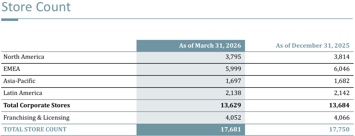 同店销售额增长7%。北美为增长引擎,实现两位数增长,EMEA 与拉美均为中个位数增长。