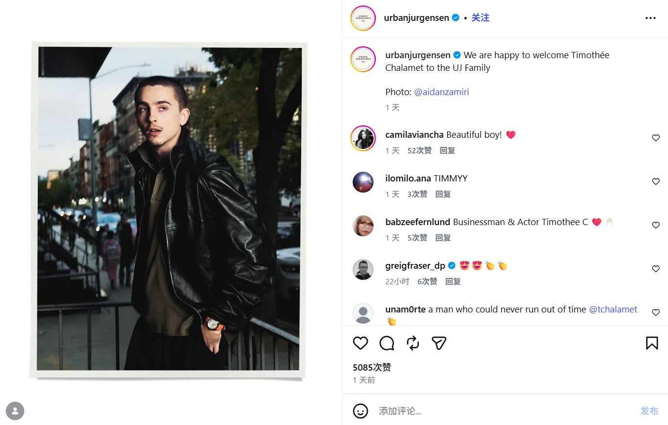 4月23日,美国好莱坞知名影星 Timothée Chalamet(提莫西·查拉梅,中文昵称“甜茶”) 联合外部战略投资者,共同收购了丹麦腕表品牌 Urban Jürgensen 的少数股权,交易的具体财务条款未披露。同时,Timothée Chalamet 将出任品牌创意顾问,并参与品牌多个项目与计划。