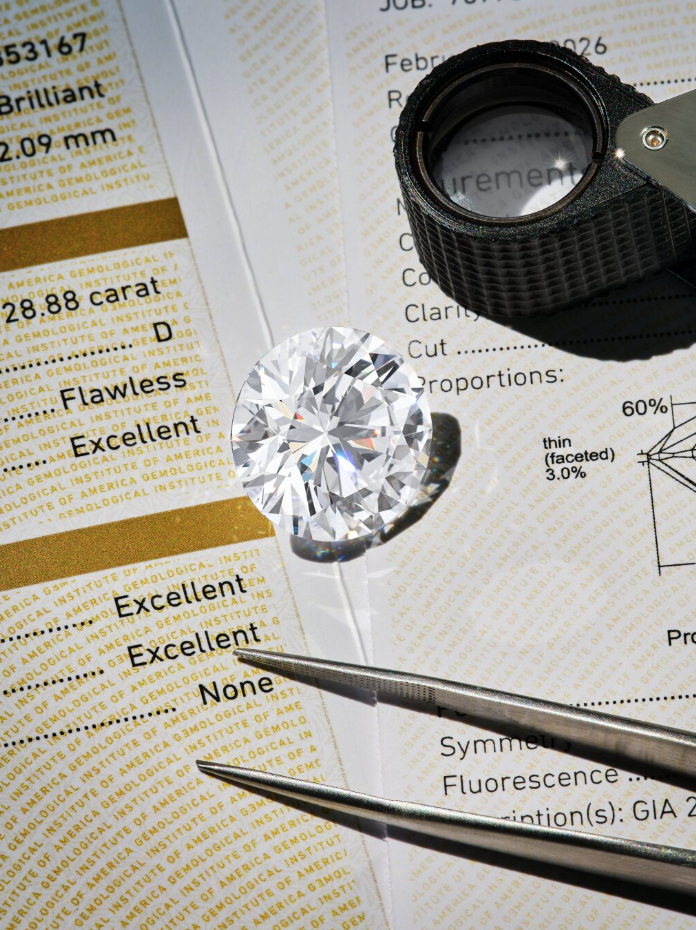 这枚28.88克拉的钻石为圆形明亮式切割,经 GIA 鉴定为D 色、内部无瑕,颜色与净度都达到最高等级。不仅如此,它还属于IIa 型钻石,位列全球最稀有的天然钻石类别,占比不足2%。IIa 型钻石基本不含氮杂质,而氮正是大多数无色钻石呈现微弱黄或棕色调的原因。这使得它的净度与颜色被资深宝石学家形容为“近乎水感”。