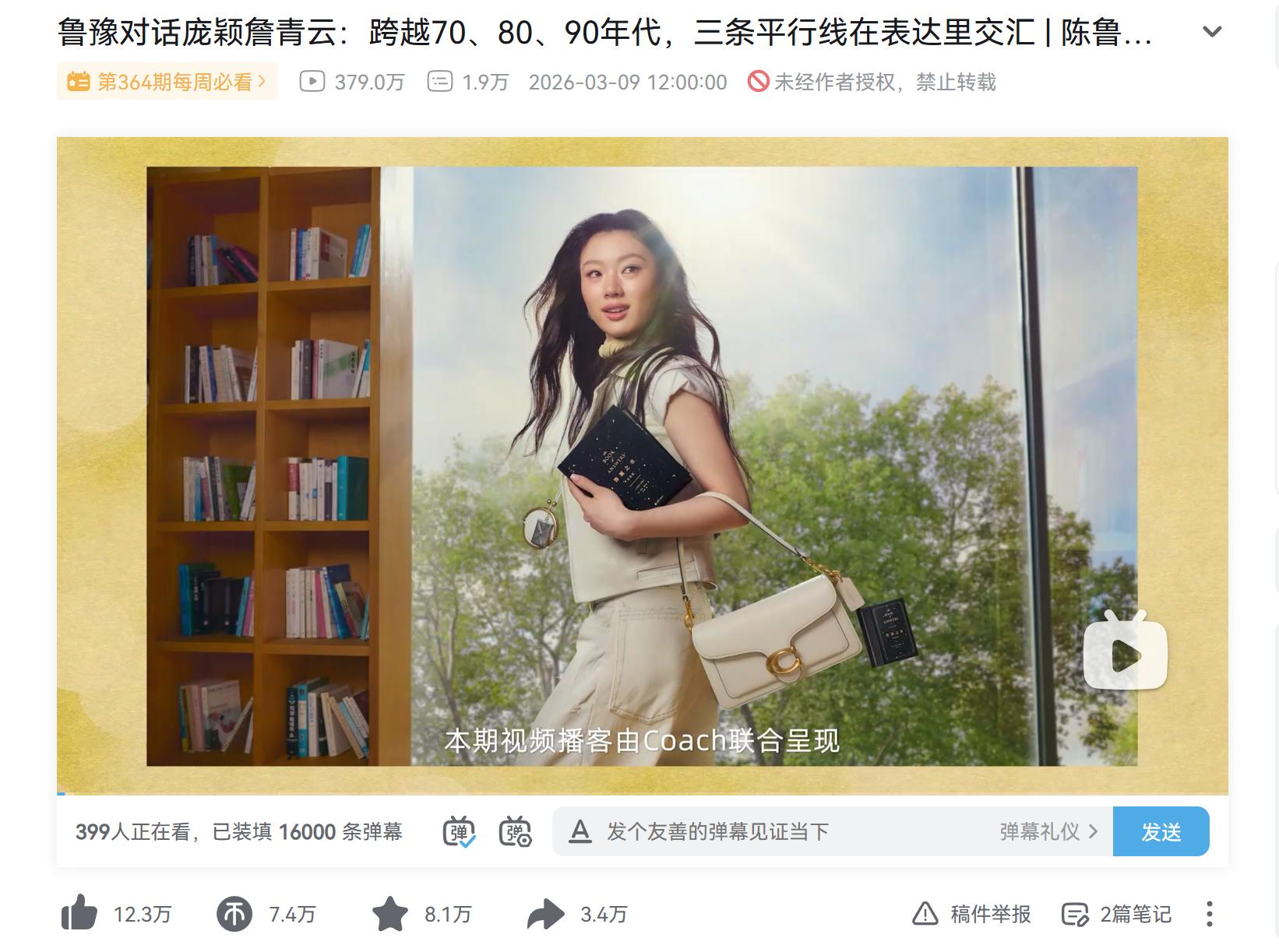 这一背景下,《华丽志》注意到近期美奢营销圈的几个可感知信号:据接近品牌方人士向《华丽志》透露,Coach 将B站列为其年度规划中唯一的平台方参与者,作为《陈鲁豫·慢谈》的季度冠名,合作多期视频播客节目;香奈儿首次将新品营销触角延伸至跨年晚会场景,登陆2025 B站跨年晚会;爱马仕则在2025秋冬女装秀期间,在B站做了一场“纯净直播”的尝试...