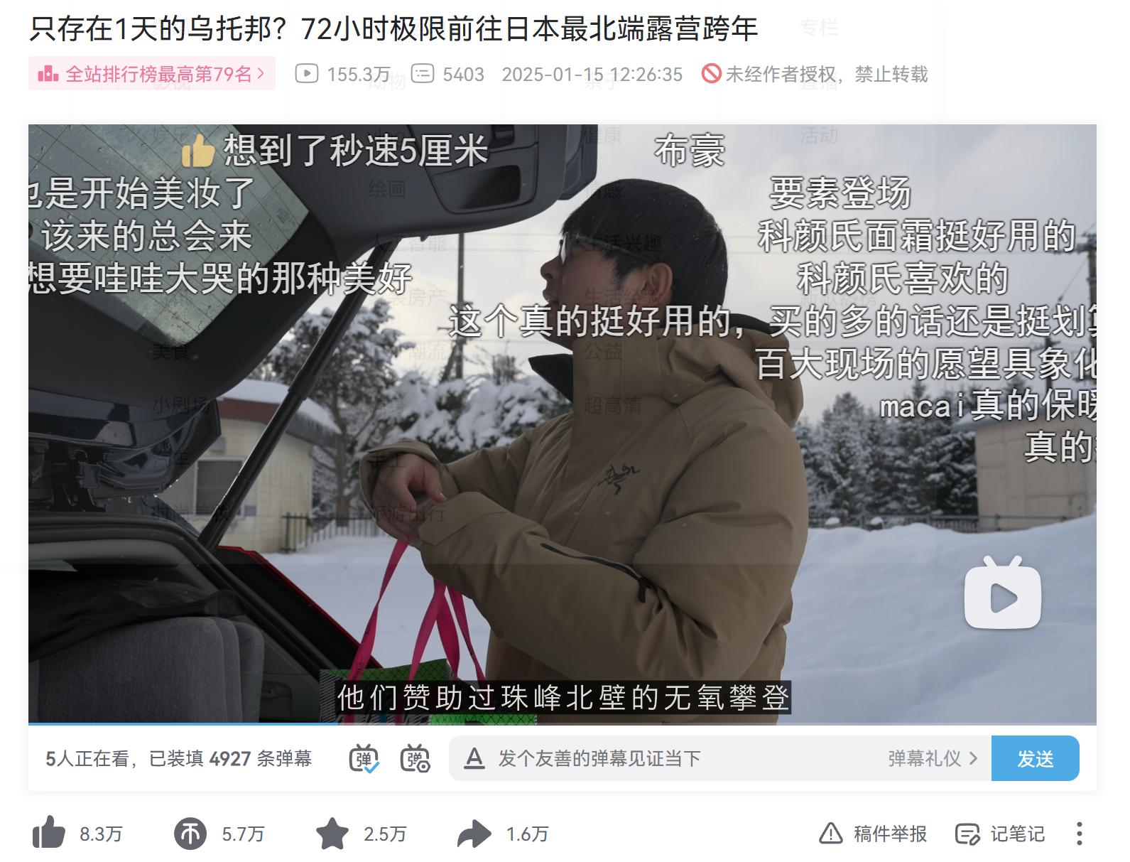 科颜氏选择了“不走寻常路”的打法——它没有把高保湿霜主要放在美妆区做种草,而是和户外、旅行、出行区的创作者深度绑定。UP主@Linksphotograph从东京出发,72小时跋涉到北海道最北的小镇,在极寒环境下测试保湿效果;“上山下海”“户外不脸红”逐渐成为这款产品在站内的硬核标签。