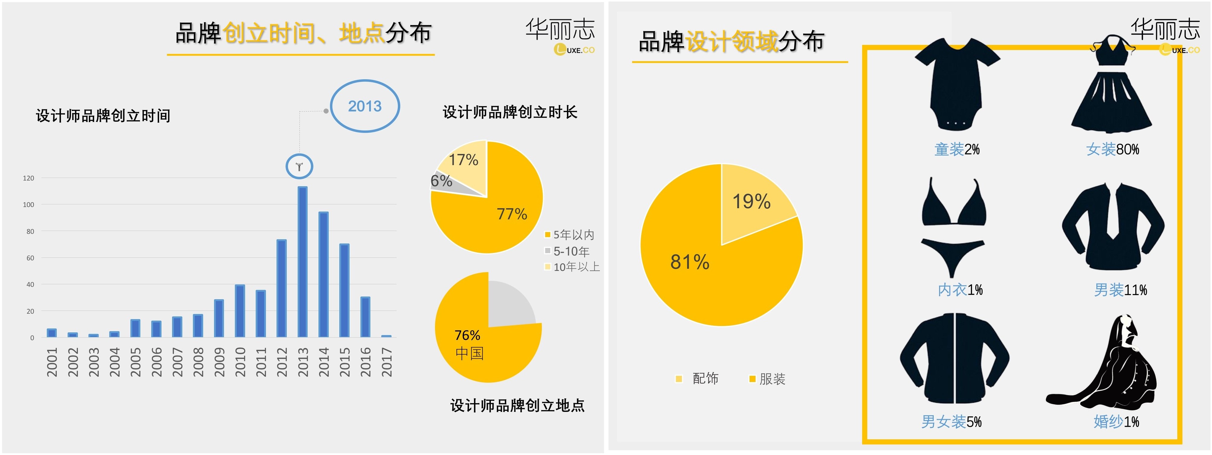 在2017年4月上海时装周期间的MODE服饰展上,《华丽志》首次发布了基于独家数据库产生的第一份重磅报告:《中国独立设计师品牌生态报告(第一版)》,通过对公开资料的收集和整理,从设计师及其品牌的基础信息、社交媒体表现以及销售渠道等角度,数据化呈现中国独立设计师品牌的发展现状。