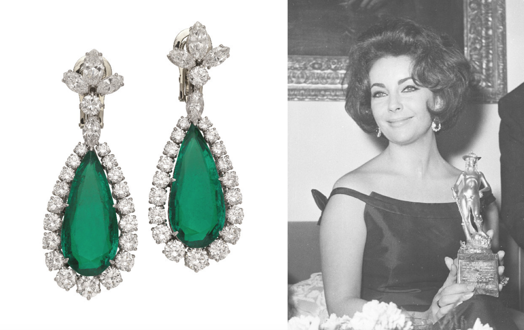 上图:伊丽莎白•泰勒佩戴宝格丽铂金耳环,镶嵌祖母绿和钻石